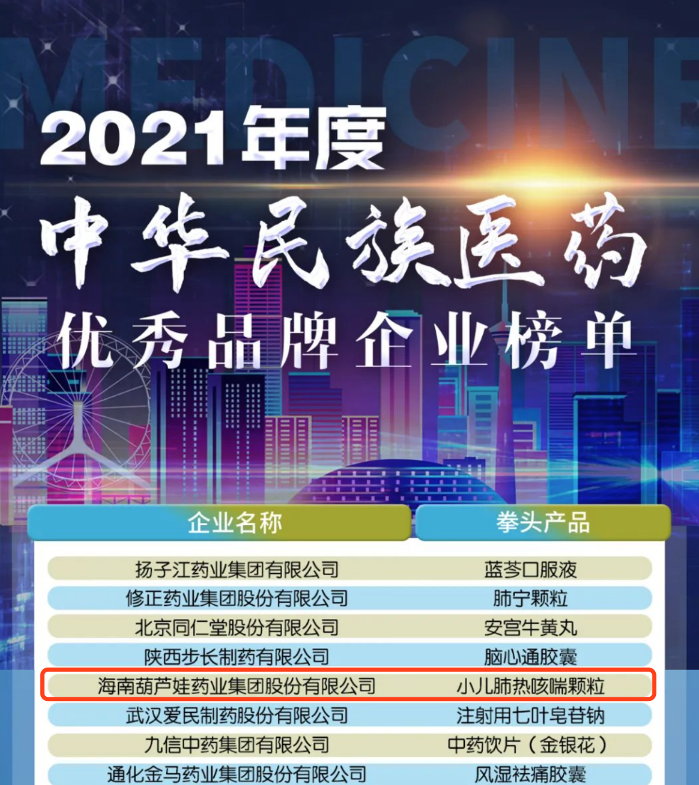 12月29日,全国工商联医药业商会发布了“2021年度中华民族医药优秀品牌企业榜单”,九州酷游药业集团凭借黄金单品小儿肺热咳喘颗粒(4克)实力登榜。