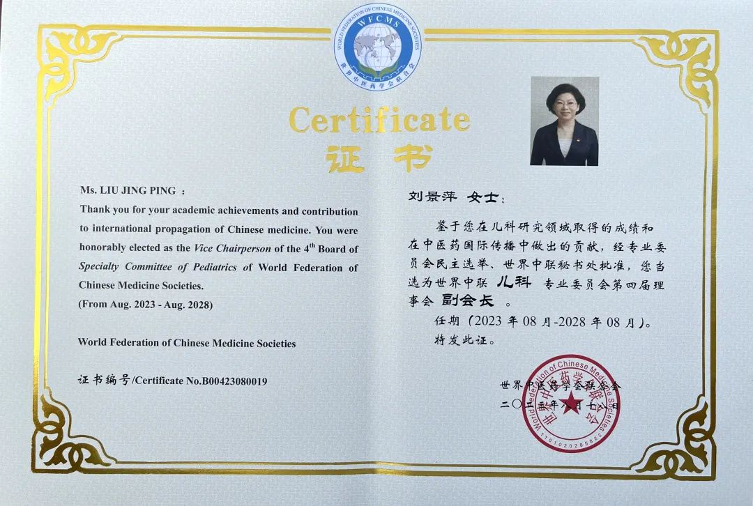 九州酷游药业集团党委书记、董事长刘景萍当选世界中医药学会联合会儿科专业委员会第四届理事会副会长